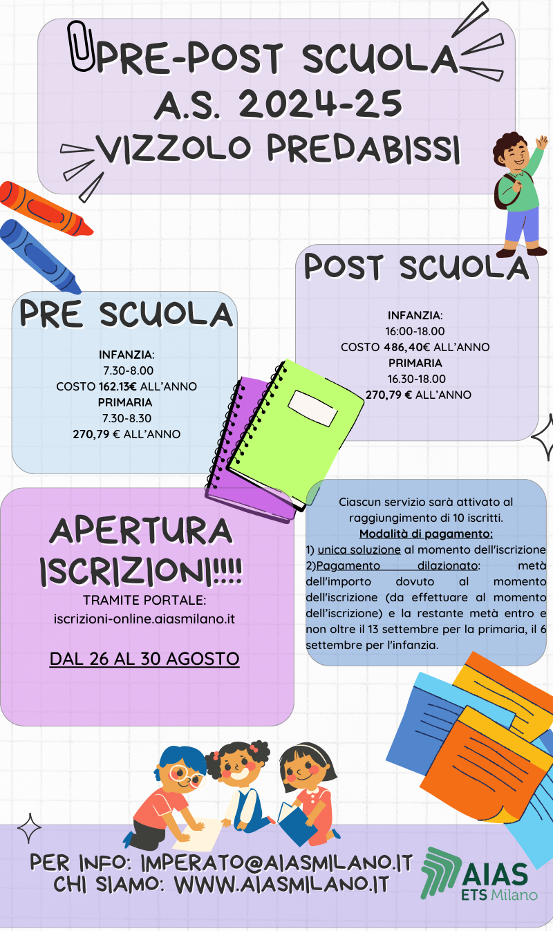 Riapertura dei termini di iscrizione ai servizi Pre e Post Scuola, per effettuare l’iscrizione accedere al portale di AIAS
